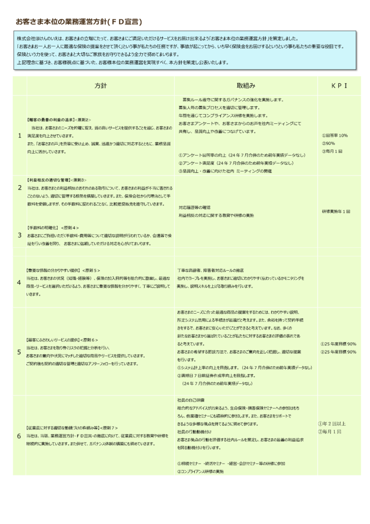 株式会社ほけんのいえは、お客さまの⽴場にたって、お客さまにご満⾜いただけるサービスをお届け出来るよう「お客さま本位の業務運営⽅針」を策定しました。